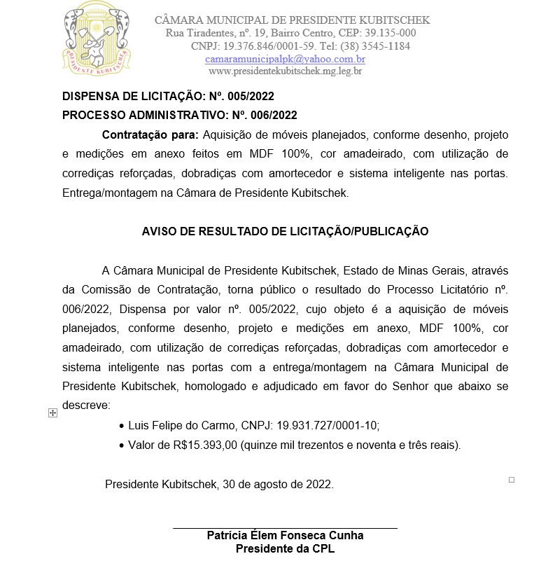 AVISO DE RESULTADO DE LICITAÇÃO - DISPENSA DE VALOR Nº 005 / PROCESSO ADMINISTRATIVO Nº 006/2022