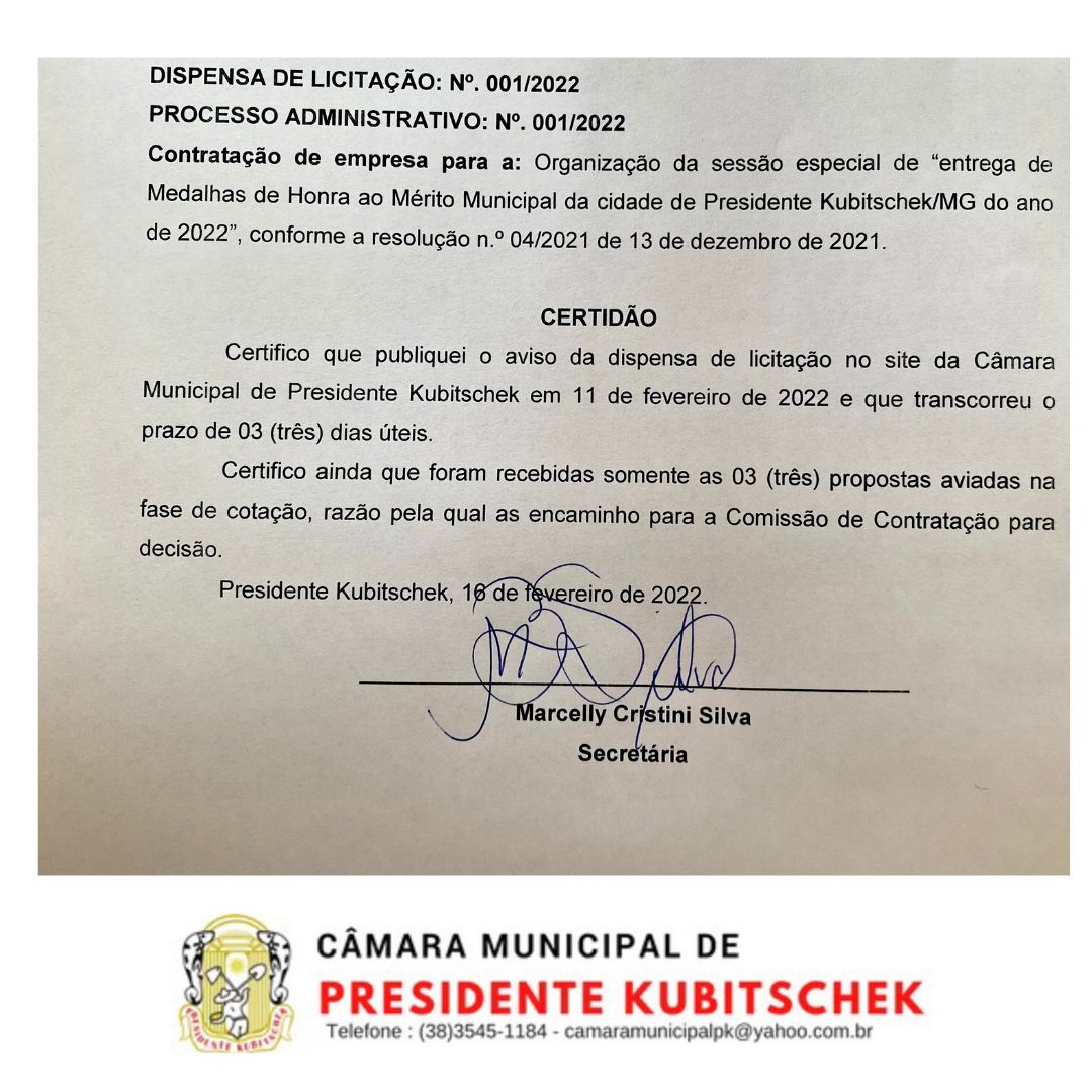 Certidão da contratação de empresa para a organização da sessão especial de entrega de medalhas de honra ao mérito municipal da cidade de Presidente Kubitschek do ano de 2022.