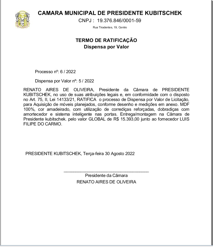 DISPENSA DE VALOR / TERMO DE RATIFICAÇÃO PARA A AQISIÇÃO DE MÓVEIS PLANEJADOS