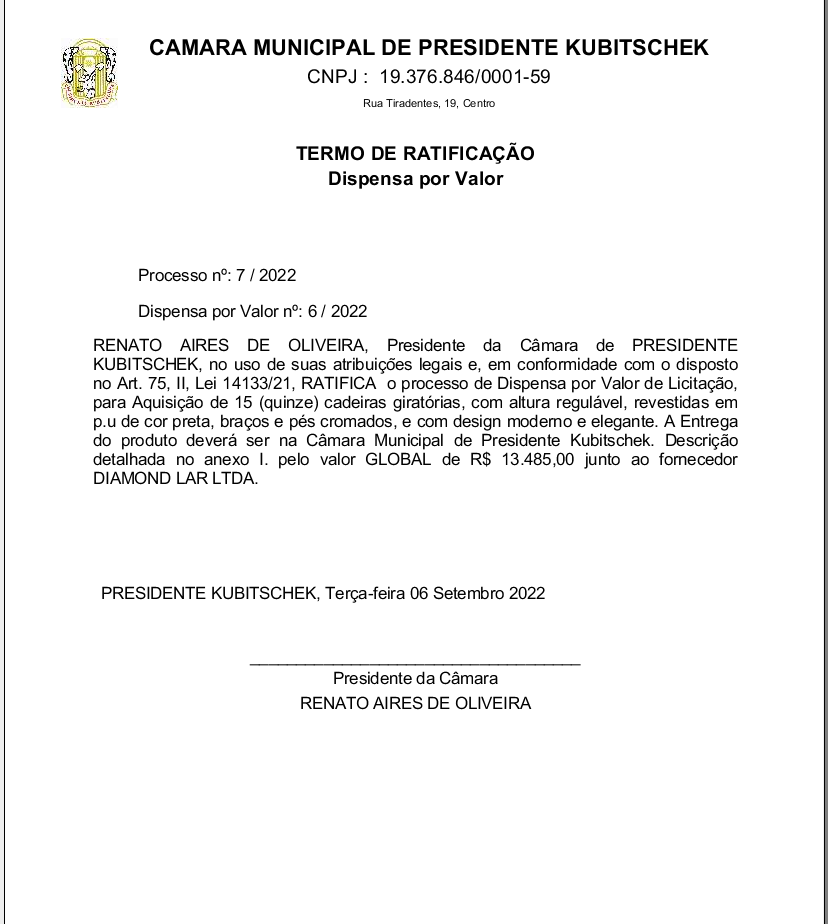 TERMO DE RATIFICAÇÃO / DISPENSA DE VALOR Nº 06 PROCESSO Nº 07/2022